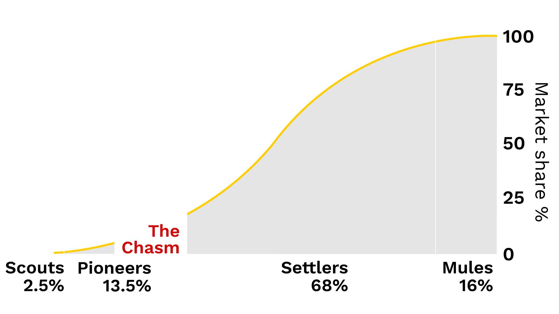 Per Geoffrey Moore in Crossing The Chasm, the first 2.5% or so of your customers will be the innovators. They are also sometimes referred to as “scouts,” since they enter new, unknown territory for the purpose of scoping it out and assessing its potential. What they are looking for most is promise, not necessarily delivery. An MVP that works is certainly important, but they don’t need or even expect full-featured perfection. They can “see around the corner” to a product’s future. They may not be your intended long-term customer, but you need to find a way to attract them, as they are the momentum builders.